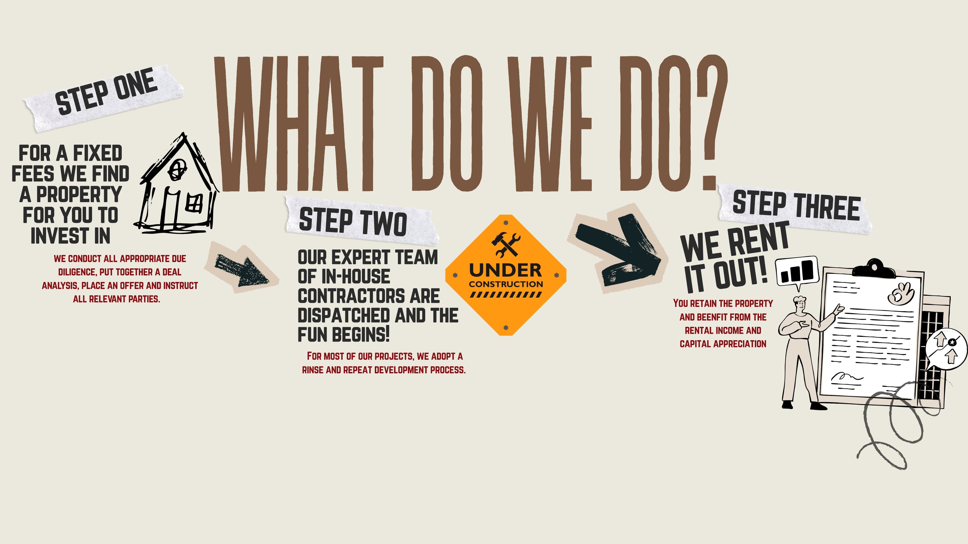 The process begins with a consultation call to review your goals and discuss the development and investment approach. Because you are purchasing the property, your involvement is higher at the start. After that initial phase, the process is largely hands-off.